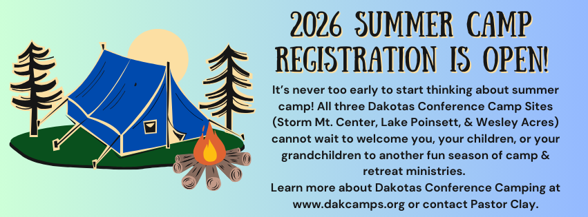 - Early Bird Deadline: Register for any Dakotas United Methodist Camp event at Lake Poinsett, Storm Mountain, or Wesley Acres by April 30, 2026, and receive a $25 Camp Store Credit. This credit may be redeemed for snacks at the canteen or items from the camp store.